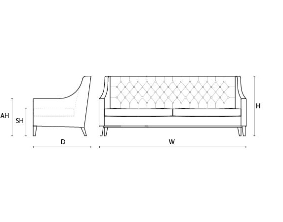 W: 215cm / D: 85cm / H: 89cm / SH: 43cm / AH: 55cm